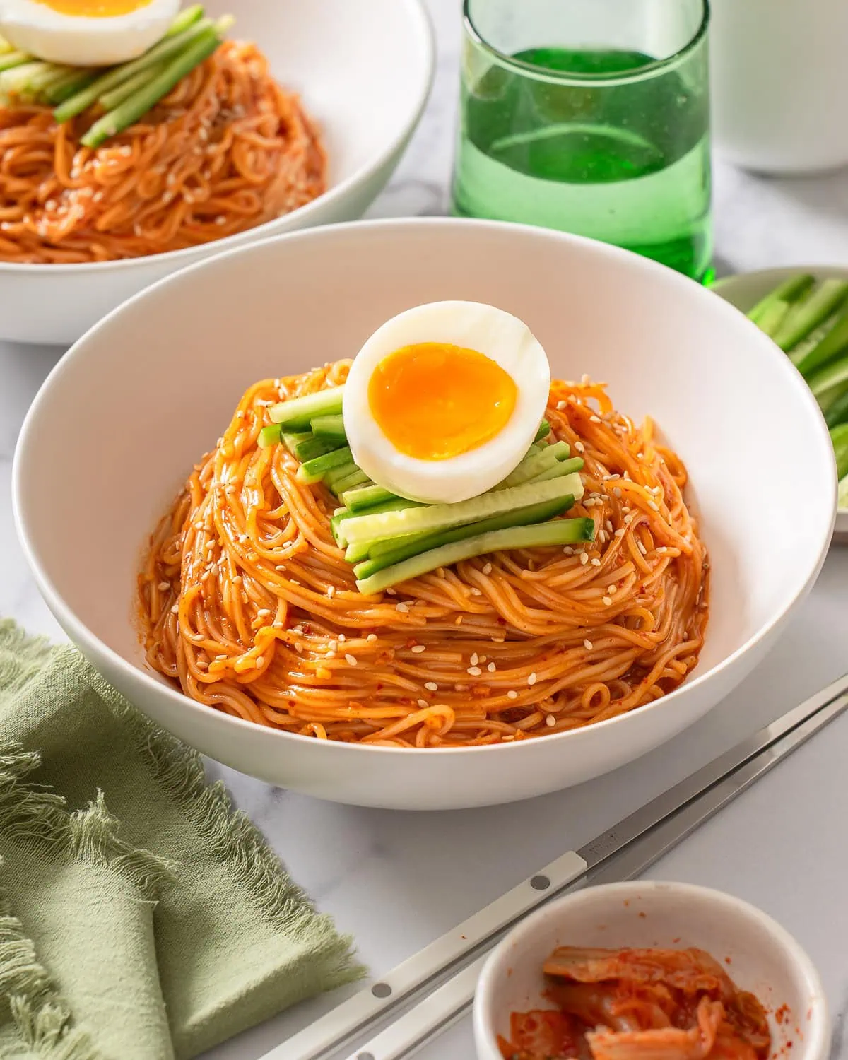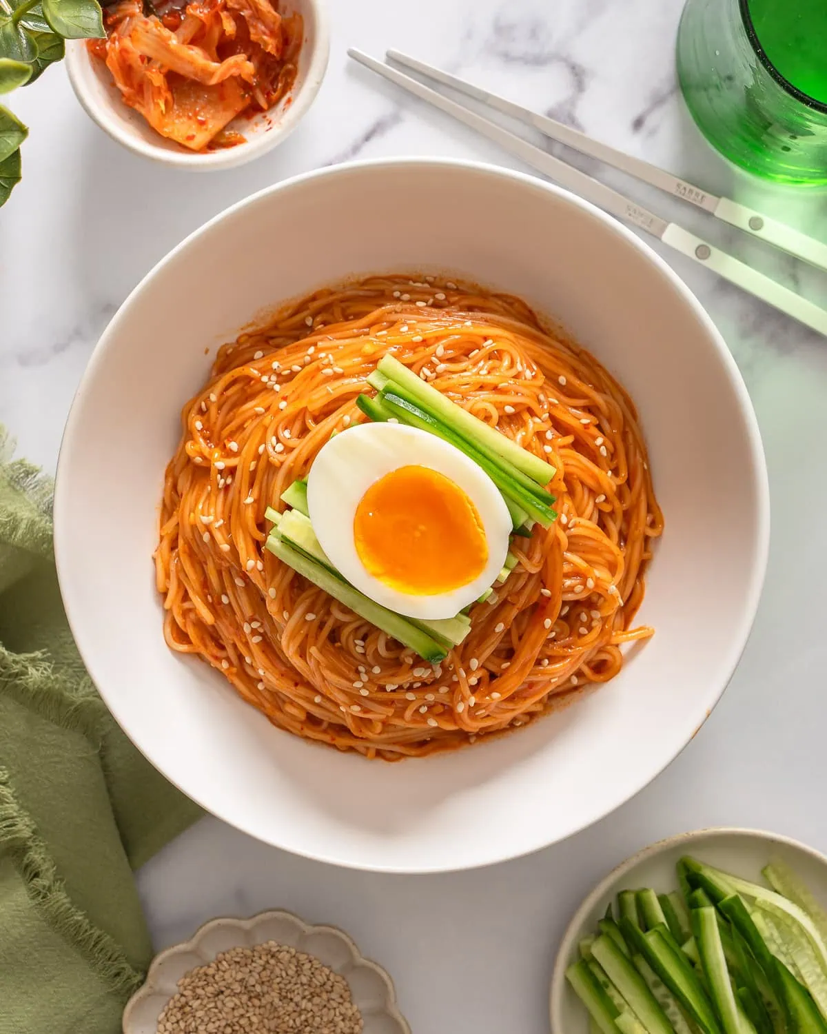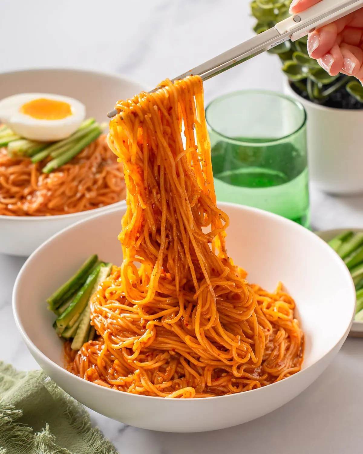 Bibim Guksu Easy 10 Minuten mit kalten Nudeln mit einer süßen und würzigen Guchang -Sauce mit frischem Gurken und einem weichen Ei. Jeder Bissen dieser koreanischen, würzigen kalten Nudeln ist unglaublich erfrischend und voller Geschmacksrichtungen.
